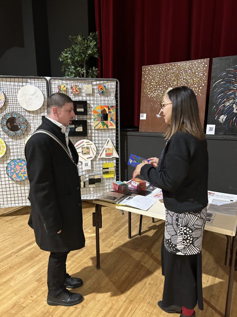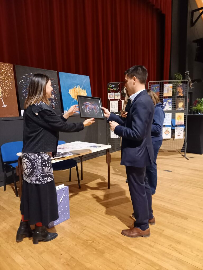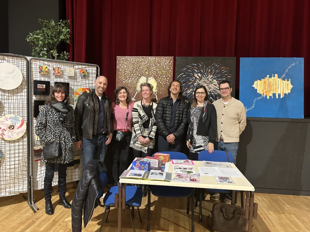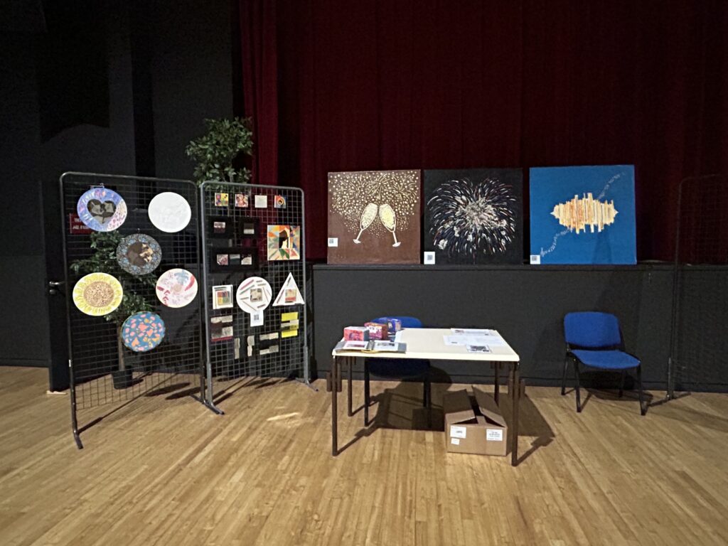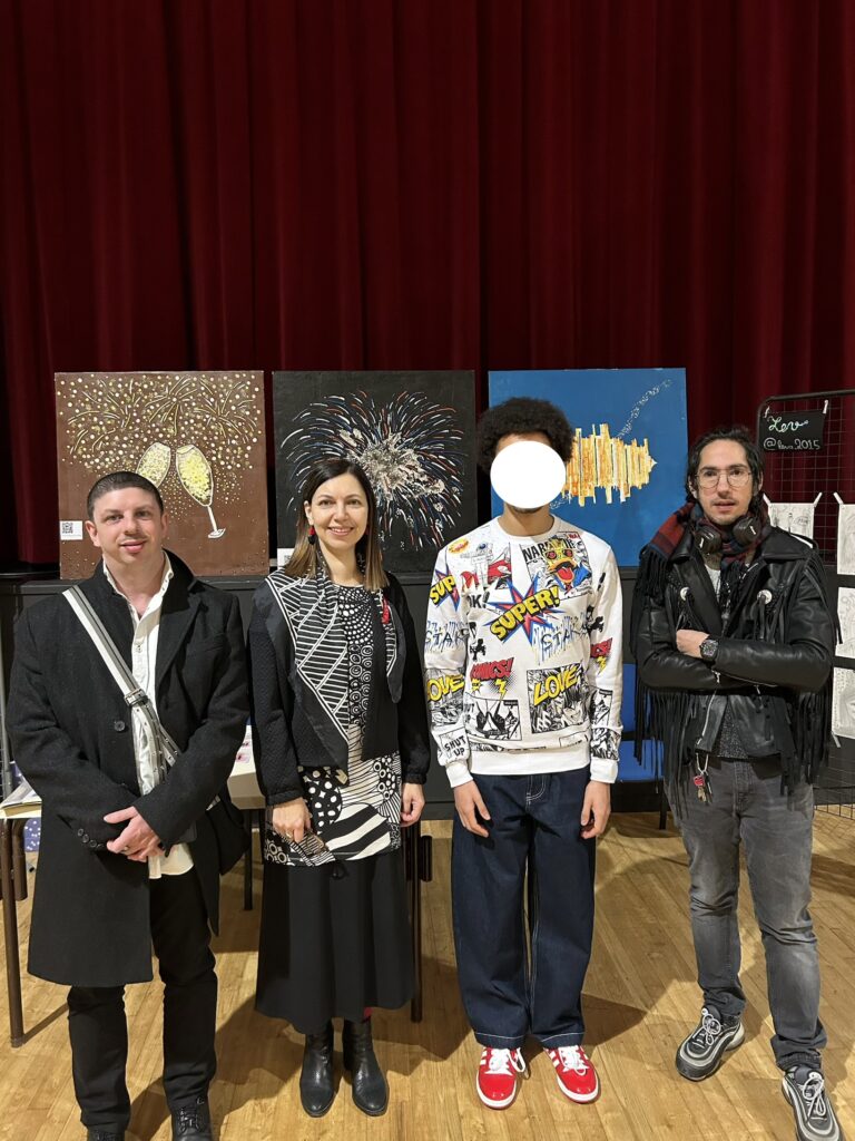 Le 8 février, nous avons présenté toutes nos œuvres réalisées sur bois lors de l’exposition annuelle à Wissous intitulée « L’Art dans tous ses états ». Cette exposition a permis de mettre en lumière la diversité et la créativité de nos réalisations. Trois grandes œuvres, conçues précédemment pour le concours « Les Carrés d’Art » sur le thème « Un jour de fête », étaient également à l’honneur. Elles représentaient un feu d’artifice éclatant, des coupes de champagne pétillantes et des sons de musique vibrants. Ces créations étaient le fruit d’un travail collectif des artistes Pedro, Fousseiny, Essam et Jacques-Oscar. Ce dernier avait également intégré dans ses œuvres le concept du musée du Futur, s’inspirant de l’architecture audacieuse du centre Pompidou.