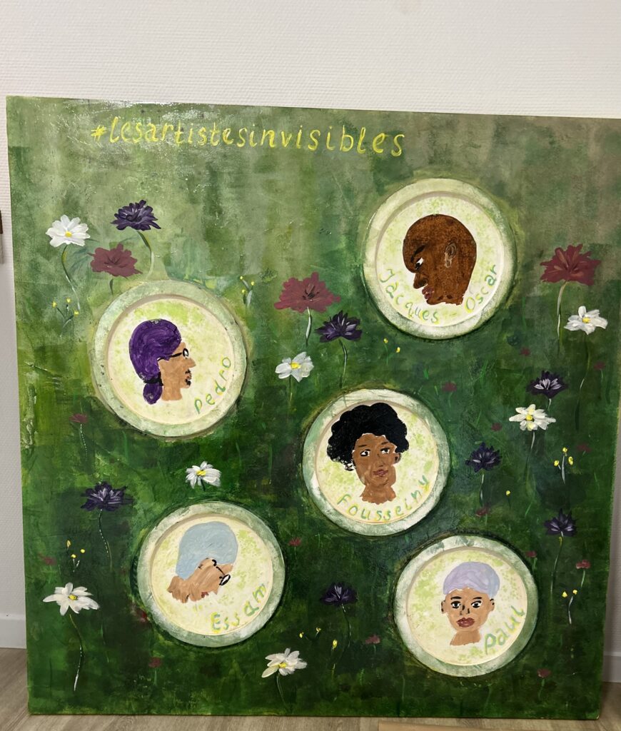 La deuxième œuvre, « Artistes dans la prairie », représente cinq portraits des artistes de notre atelier. Elle est également réalisée en technique en relief, avec l’utilisation de cadres ronds en bois.