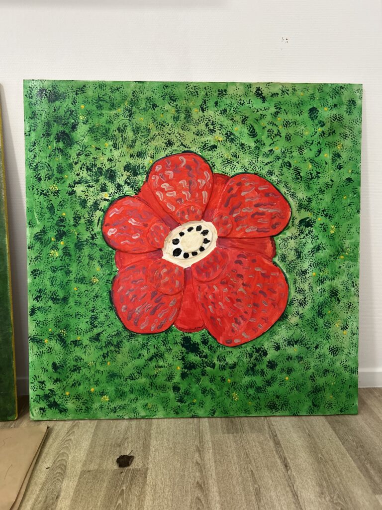 Le thème de cette année est « Prairie ». Nous avons réalisé une œuvre intitulée « Coquelicot dans la prairie », en technique en relief, avec de l’enduit extérieur, de l’acrylique et du vernis.