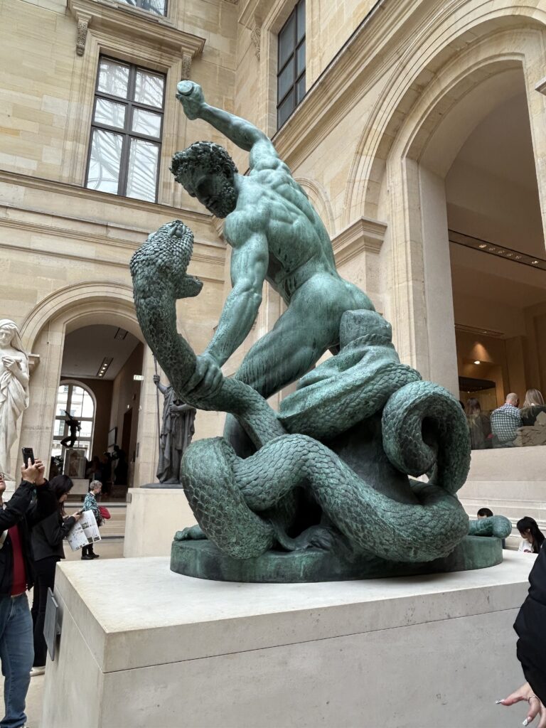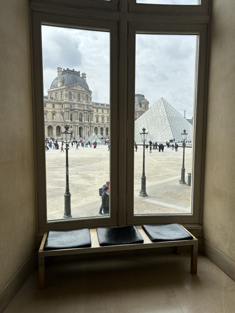 Au Louvre, il était impossible de ne pas aller à la rencontre de la Joconde. Pour la voir, nous avons traversé la Grande Galerie, l’une des salles les plus célèbres du musée, qui s’étend sur toute la longueur de l’aile Denon. Dans cette galerie sont exposées des œuvres des maîtres italiens du XVe et XVIe siècles, dont Léonard de Vinci, Raphaël, Titien et bien d’autres. Comme l’a souligné Pedro : « Au Louvre, il ne s’agit pas de choisir si une œuvre nous plaît ou non : toutes sont si parfaites qu’elles vous captivent immédiatement, par les couleurs, le style, les proportions, ne laissant place à aucun doute. »